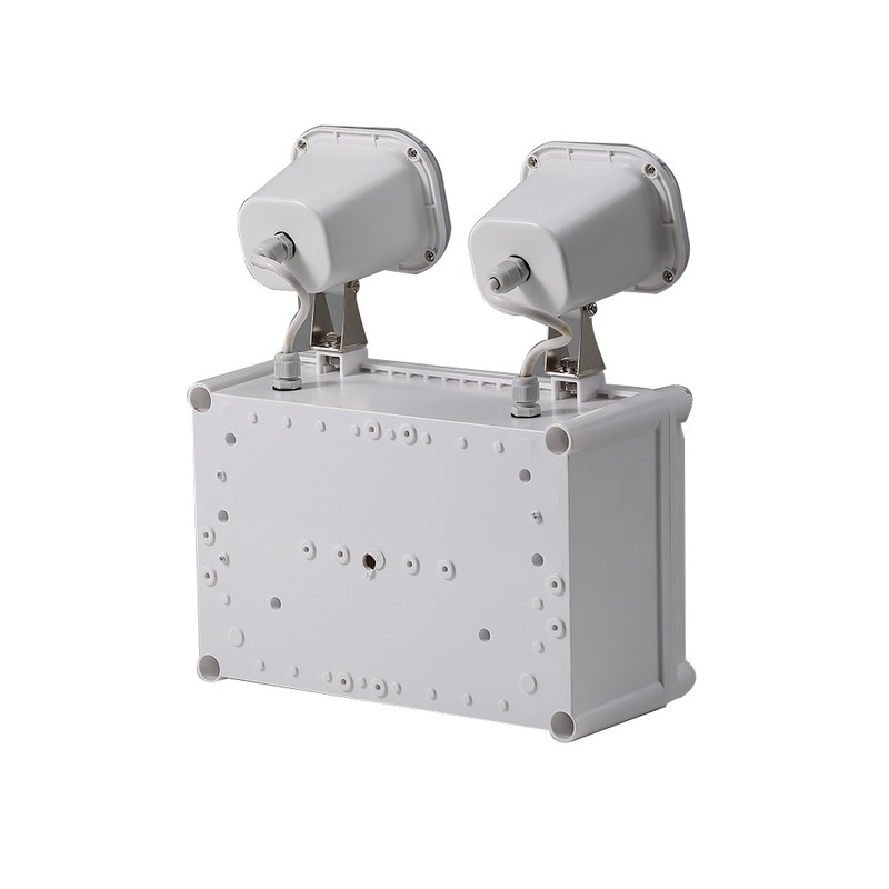 Professional wall-mounted emergency light with twin LED spotlights, designed for hotel and commercial applications. Features IP65 waterproof rating and high lumen output for reliable emergency illumination.